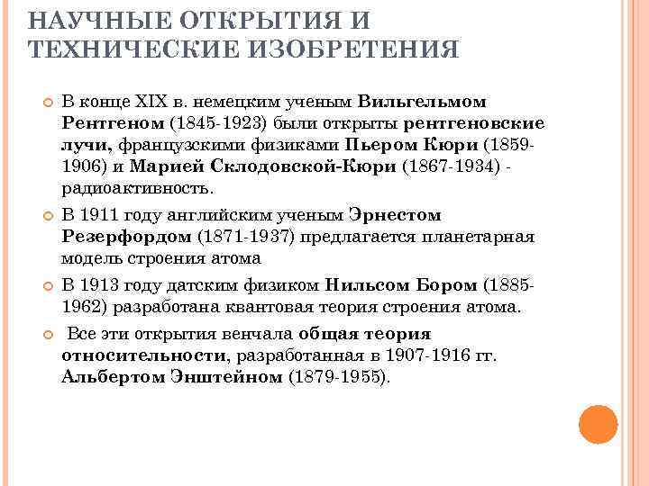 НАУЧНЫЕ ОТКРЫТИЯ И ТЕХНИЧЕСКИЕ ИЗОБРЕТЕНИЯ В конце XIX в. немецким ученым Вильгельмом Рентгеном (1845 1923) были открыты рентгеновские лучи, французскими физиками Пьером Кюри (1859 1906) и Марией Склодовской-Кюри (1867 1934) радиоактивность. В 1911 году английским ученым Эрнестом Резерфордом (1871 1937) предлагается планетарная модель строения атома В 1913 году датским физиком Нильсом Бором (1885 1962) разработана квантовая теория строения атома. Все эти открытия венчала общая теория относительности, разработанная в 1907 1916 гг. Альбертом Энштейном (1879 1955).