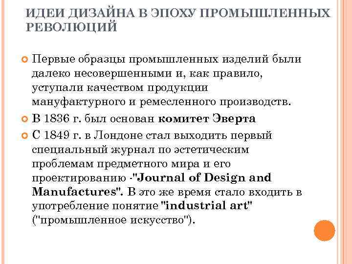 ИДЕИ ДИЗАЙНА В ЭПОХУ ПРОМЫШЛЕННЫХ РЕВОЛЮЦИЙ Первые образцы промышленных изделий были далеко несовершенными и, как правило, уступали качеством продукции мануфактурного и ремесленного производств. В 1836 г. был основан комитет Эверта С 1849 г. в Лондоне стал выходить первый специальный журнал по эстетическим проблемам предметного мира и его проектированию "Journal of Design and Manufactures". В это же время стало входить в употребление понятие "industrial art" ("промышленное искусство").