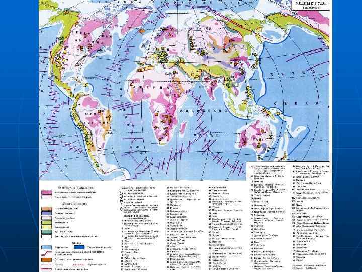 Медно-порфировые месторождения n Месторождения расположены в глобальных металлогенических поясах, представляющих собой разновозрастные складчатые системы. Известно до 150 медно порфировых месторождений. Наиболее насыщены ими тихоокеанское побережье Северной и Южной Америки: Перу — Чилийская (Чукикамата, Эль Теньенте, Эль Сальвадор, Эль Абра и др. ), Американско Мексиканская (Бингем Каньон, Галена, Кананеа, Серро Колорадо) и Канадская провинции, в меньшей мере в Средиземноморском (Армения, Казахстан, Турция, Афганистан) и Центральноазиатском подвижных поясах. К этому типу относятся месторождения Казахстана (Коунрад, Бощекуль), Средней Азии (Кальмакыр, Дальнее, Сары Чеку), Южного Урала (Салаватское), Закавказья (Каджаран и др. ), Тувы (Агсуг).