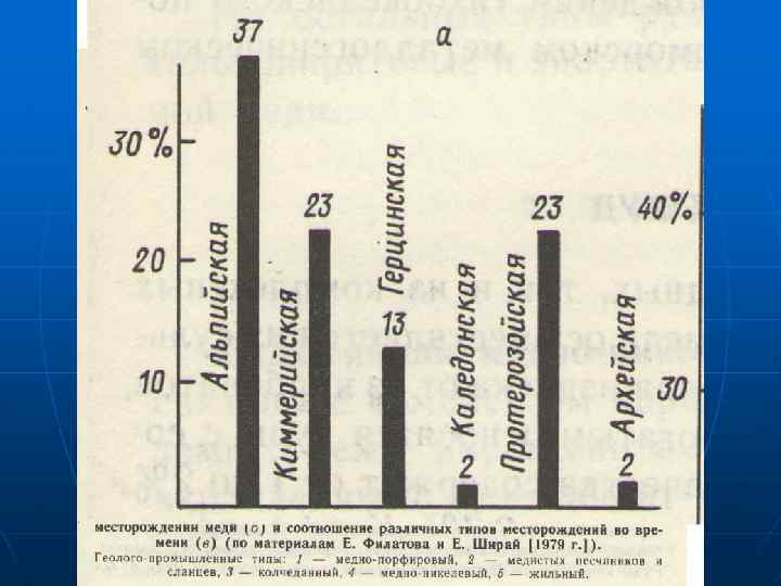 Месторождения медистых песчаников и сланцев n В возрастном отношении медистые песчаники и сланцы встречаются в осадочных комплексах от раннего протерозоя до неогена включительно. На этом фоне выделяются два максимума развития оруденения: докембрийский (60% мировых запасов) — Восточная Сибирь в России, Заир Замбийский медный пояс, Олимпик Дам в Австралии и верхнепалеозойский (30%) — Центральный Казахстан, Польша и Германия. На территории России и Казахстана докембрийское оруденение в основном приходится на ранние периоды протерозоя — Кодаро Удоканская зона, а палеозойское — на девон каменноугольный период (39%) — Джезказганская зона и др. Заметное количество меди концентрируется также в осадочных толщах пермо триасового, кембрийского возраста, юры, мела, палеогена и неогена.