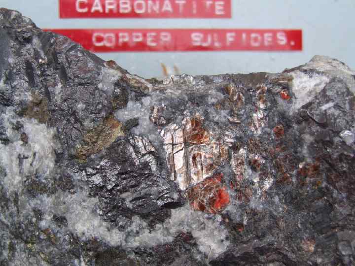 МЕДНОРУДНЫЕ ФОРМАЦИИ n n Медно-карбонатитовая. Представлена уникальным месторождением Палабора в Южной Африке. Медное оруденение (халькопирит, борнит, халькозин, валлериит, кубанит) локализуется в карбонатитах в виде прожилков и зон вкрапленности. Рудное тело включает в себя центральную вертикальную интрузию карбонатитов размером от 100 до 600 м в поперечнике и глубиной свыше 1000 м со средним содержанием около 1% меди и окружающую зону низкосортных руд (около 0, 5% меди). Запасы 315 млн. т руды со средним содержанием 0, 69% меди. Кальцитовые карбонатиты содержат кроме медных минералов титаномагнетит, бадделеит, ураноторианит.