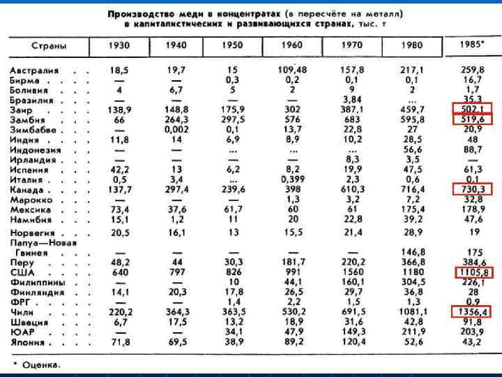 n n Месторождения Cu, содержащие запасы более 5 млн. т, относятся к уникальным(всего известно 18 таких месторождения, 4 из них находятся в России). Крупные месторождения имеют запасы от 1 до 5; средние – от 0, 2 до 1; мелкие – менее 0, 2 млн. т. Богатые руды содержат более 2% Cu; рядовые – 1 2% Cu; бедные – менее 1% Cu. Среднее содержание в добываемых рудах сейчас составляет 1 -0, 8% Cu. Для сравнения, в начале XX века добывали руды с содержанием 3, 8% Cu, а в XIX веке добывались руды со средним содержанием 10% Cu.