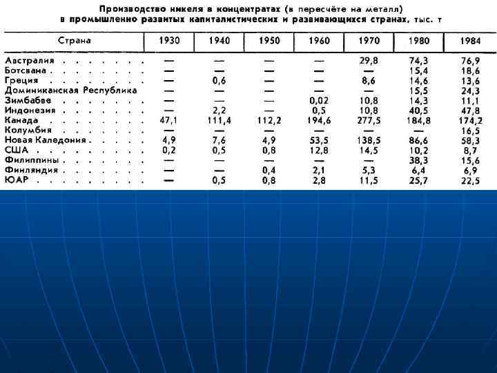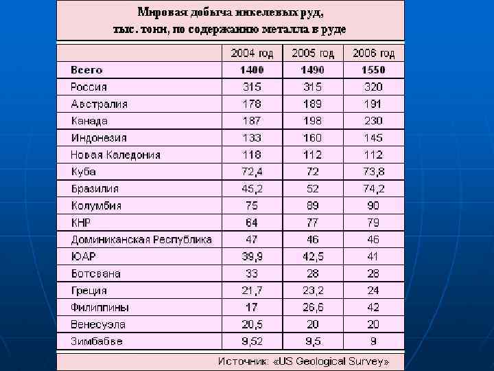 n n n Общие запасы Ni оцениваются 90— 95 млн. т. Наиболее крупные запасы сосредоточены в Новой Каледонии (30%), Канаде (12), Индонезии (11), Филиппинах (9), Австралии (4, 5), Бразилии, ЮАР. Почти все мировые ресурсы заключены в месторождениях мезозойско кайнозойского (72%) и докембрийского (27%) возраста. Разработка месторождений ведется в 26 странах мира. Основу минерально сырьевой базы Ni составляют 35 крупных месторождений, в которых сосредоточено 91% мировых разведанных запасов и 95% мировой добычи. Ежегодное производство металлического Ni превышает 850 тыс. т. Основными производителями являются Россия и Канада, затем Австралия, Индонезия, Новая Каледония.