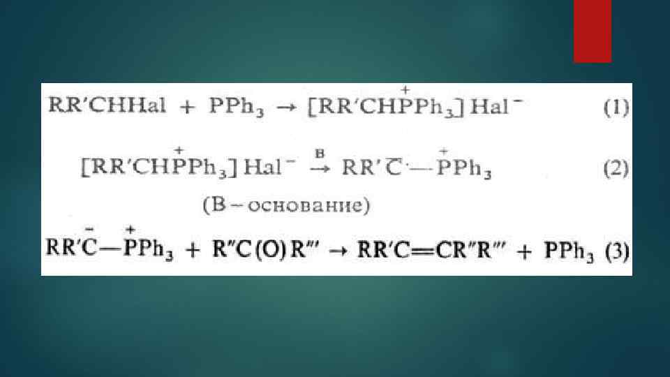 Основу тактики органический синтез составляют различные синтетические методы, каждый из которых представляет собой стандартную совокупность одной или несколько реакций и приемов выделения продуктов, которые обеспечивают возможность построения или разрыва определенного типа связи (или связей), необходимой для синтеза целевого соединения. Важные характеристики эффективного синтетического метода - общность (слабая зависимость результата от конкретных особенностей структуры исходных соединений), селективность (участие в основных реакциях метода лишь определенных функциональных групп) и высокие выходы продуктов. Типичным примером эффективного синтетического метода может служить синтез олефинов по Виттигу (р-ции 1 -3) из алкилгалогенидов и карбонильных соединений: