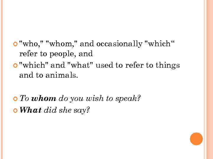 "who, " "whom, " and occasionally "which“ refer to people, and "which" and "what" used to refer to things and to animals. whom do you wish to speak? What did she say? To