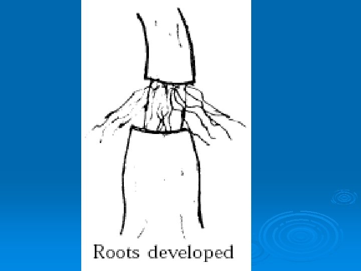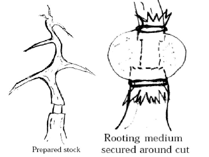 Ground layering Ø In ground layering a branch is bent to reach the ground or a pot of soil. The area where roots are desired is scarred, dusted with rooting hormone, buried in the soil and weighted, tied or pegged down securely. Ø An alternative to scarring is to split the branch and inserting a stone to spread the cut, dusting with rooting hormone and burying.