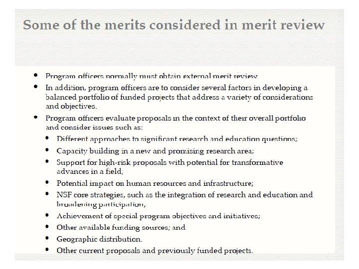 Proposed Changes to the Merit Review Criteria Merit Review Principles and Criteria The identification and description of the merit review criteria are firmly grounded in the following principles: 1. All NSF projects should be of the highest intellectual merit with the potential to advance the frontiers of knowledge. 2. Collectively, NSF projects should help to advance a broad set of important national goals, including: • Increased economic competitiveness of the United States. • Development of a globally competitive STEM workforce. • Increased participation of women, persons with disabilities, and underrepresented minorities in STEM. • Increased partnerships between academia and industry. • Improved pre-K– 12 STEM education and teacher development. • Improved undergraduate STEM education. 1. Increased public scientific literacy and public engagement with science and technology. 2. Increased national security. 3. Enhanced infrastructure for research and education, including facilities, instrumentation, networks and partnerships. • Broader impacts may be achieved through the research itself, through activities that are directly related to specific research projects, or through activities that are supported by the project but ancillary to the research. All are valuable approaches for advancing important national goals. • Ongoing application of these criteria should be subject to appropriate assessment developed using reasonable metrics over a period of time.