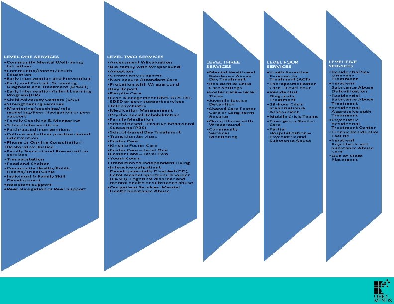 D. The Building Blocks of the System of Care § A community partnership among families, youth, schools, and public and private organizations to provide coordinated mental health services Level Five Children Youth Level Four Culturally/Linguistic Competent Level Three Individualized Level Two Level One Social Services Child Welfare Families Community Based Decision-making Coordinated Education Health Strengths-Based Behavioral Health Vocational Community Child-Centered & Family Focus Care Accessible Juvenile Justice Community Supports