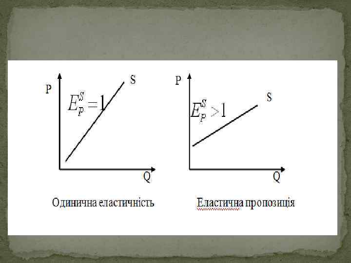 Для пропозиції, як і для попиту, розрізняють декілька випадків еластичності: Еластичне пропонування Е > 1 , означає що продавці чутливі до зміни ціни. Їм простіше збільшувати обсяг виробництва, вони мають переваги у використанні вигоди від підвищення ціни товару. Нееластичне пропонування E < 1, починається від горизонтальної осі. Пропонування з одиничною еластичністю Абсолютно нееластичне пропонування означає, що обсяг пропонування не реагує на зміни ціни. Крива пропонування є вертикальною прямою Абсолютно еластичне пропонування має місце, коли пропонування зов сім відсутнє доти, доки ціна не досягне певного рівня, за якого продав ці готові продати будь яку кількість продукції. В цьому випадку крива пропонування є горизонтальною лінією Основним фактором еластичності пропонування є фак тор часу.