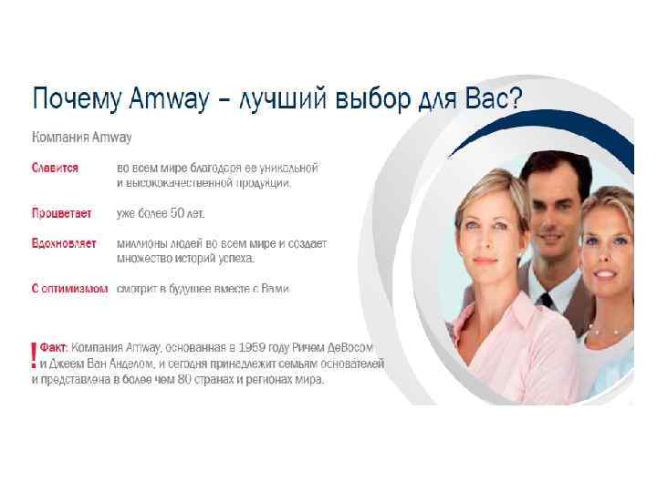 Преимущества - ГИБКИЙ ГРАФИК (СОВМЕЩАЯ С ОСНОВНЫМ МЕСТОМ РАБОТЫ) - ВОЗМОЖНОСТЬ ПОЛУЧЕНИЯ ДОПОЛНИТЕЛЬНОГО ДОХОДА - МИНИМАЛЬНЫЙ РИСК - ВЗАИМОВЫГОДНЫЕ ПАРТНЁРСКИЕ ОТНОШЕНИЯ - ОБУЧЕНИЕ - РАЗВИТИЕ СОБСТВЕННОГО БИЗНЕСА - УРОВЕНЬ ДОХОДА В СООТВЕТСТВИИ С ПРИЛАГАЕМЫМИ УСИЛИЯМИ -ПРИЗНАНИЕ ВАШИХ УСИЛИЙ - ЭКСКЛЮЗИВНЫЙ ТОВАР * Компания Amway является активным членом Ассоциации Прямых Продаж (АПП), www. rdsa. ru.