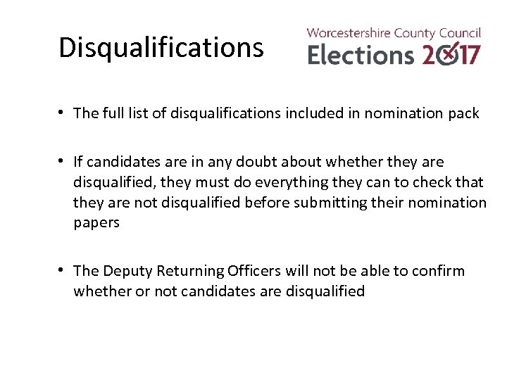 Disqualifications • The full list of disqualifications included in nomination pack • If candidates are in any doubt about whether they are disqualified, they must do everything they can to check that they are not disqualified before submitting their nomination papers • The Deputy Returning Officers will not be able to confirm whether or not candidates are disqualified