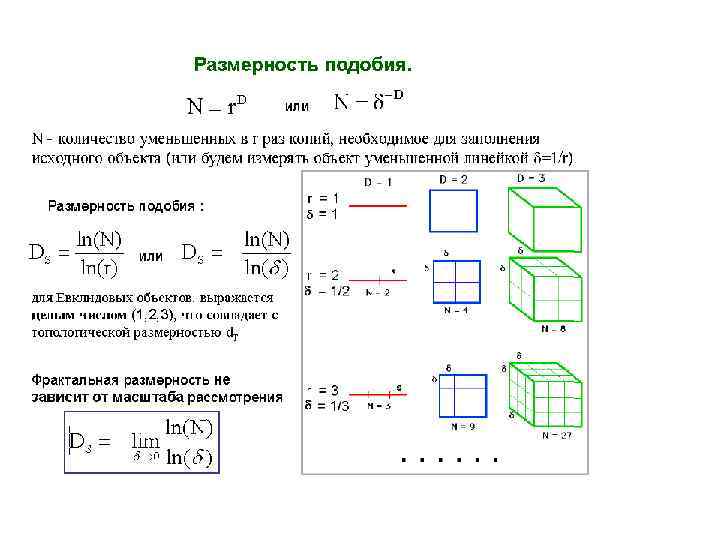 Вывод размерности Вокруг каждого элемента этого множества, как вокруг центра, опишем сферу радиуса ε. Если множество бесконечно, то и таких сфер получится бесконечно много. По лемме Гейне-Бореля, для любого компактного множества существует конечное подпокрытие – конечный набор сфер радиуса ε, таких, что каждый элемент множества принадлежит, по крайней мере, одной сфере, не обязательно совпадая с ее центром. Пусть N(ε) – число сфер в конечном подпокрытии множества. Для гладкого объекта (отрезка прямой или окружности): Но для негладкого объекта: