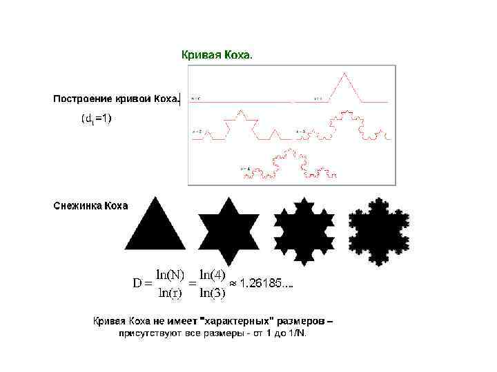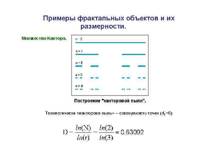 Вывод размерности Это означает, что при разложении N(ε) в ряд по ε, разложение содержит не только тейлоровскую, но лорановскую часть. Пусть , D>0 - главный член лорановской части разложения N(ε) по ε. Тогда при ε → 0 Показатель D называется размерностью Хаусдорфа-Безиковича. Логарифмируя предыдущее выражение, получаем: откуда