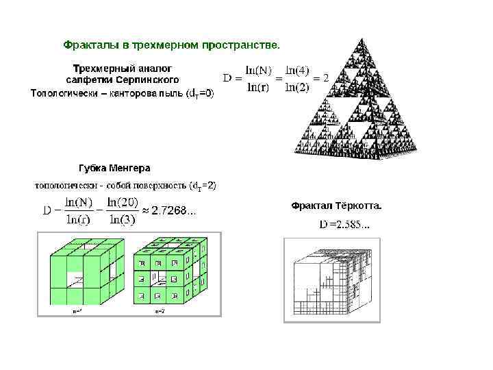 Топологическая размерность • Каждый знает, что: точка имеет 0 измерений, линия имеет размерность 1, квадрат 2 -х размерный, куб 3 -х размерный. • Такая размерность называется топологической размерностью. Она использовалась в течение тысячелетий, но оказалась неточной при разработке фракталов. • Слово ”фрактал” произведено от латинского “fractus”, от которого происходят английские термины “fraction”, “fractional” дробь, дробный • В 1987 г. Французский математик Бенуа Мандельброт ввел понятие фрактал: «Фракталом называется структура, состоящая из частей, которые в каком-то смысле подобны целому»