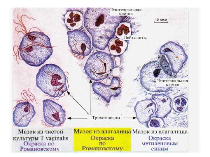 Микробиологический диагноз трихомониаза ü ü Микроскопический метод: готовят мазки из отделяемого мочеиспускательного канала, секрета предстательной железы или осадка мочи окрашивают по Романовскому-Гимзе (ядро трофозоита фиолетово-рубинового цвета, цитоплазма - голубого, а блефаропласт, жгутики, аксостиль розово-красного цвета). При фазово-контрастной микроскопии нативных препаратов (висячая капля) наблюдается подвижность трихомонад. Трихомонады по размеру близки к лейкоцитам и характеризуются толчкообразными движениями ундулирующей мембраны и жгутиков. Применяют РИФ. Культуральный метод: При хронических формах трихомонады выращивают на питательных средах, например СКДС (солевой раствор с гидролизатами казеина, дрожжей и с мальтозой).