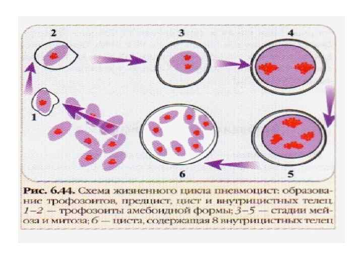 Пневмоцисты (Pneumocystis carinii) • • Условно-патогенные грибы с внеклеточным циклом развития. Однако по морфологическим и другим свойствам они ближе к простейшим. Вызывает пневмоцистоз (син. — пневмоцистная пневмония), характеризующийся развитием пневмонии у лиц с ослабленным иммунитетом (недоношенность, иммунодефицит, ВИЧ-инфекция). Возбудитель передается от человека к человеку главным образом воздушно-капельным путем. Некоторые виды пневмоцист выделяются от животных (мышей, крыс, кроликов, собак, коров. свиней, голубей). Цикл развития пневмоцист включает образование трофозоитов, предцист, цист и внутрицистных телец. Трофозоиты - клетки, покрытые пелликулой, имеют овальную или амебоидную форму, размер 1, 5 -5 мкм. Они с помощью выростов пелликулы прикрепляются к эпителию альвеол (внеклеточный паразит). Трофозоит округляется, приобретает клеточную стенку, превращаясь в предцисту и в цисту. Цисга размером 4 -8 мкм, имеет толстую, трехслойную, стенку. Внутри цисты образуется 6 -8 дочерних внутрицистных тел (спорозоитов). которые имеют 1 -2 мкм в диаметре, мелкое ядро и окружены двухслойной оболочкой. После выхода из цисты они превращаются во внеклеточные трофозоиты.