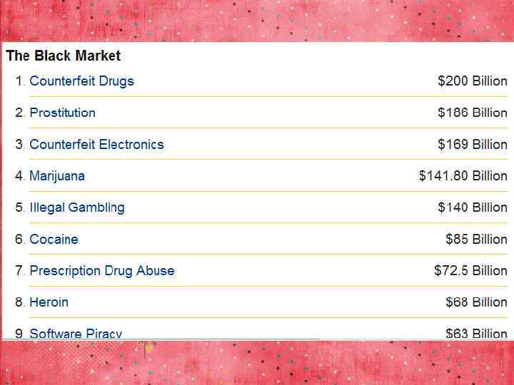 Selected Prices of Prostitutes • China : $100 to $400 in Beijing • France: $207 per client in apartment complex • Germany: Flat rate of $65 at brothel • Hong Kong: $232 in hostess bar • India: $1, 000 for sex with a virgin, $1 for sex with adult • Japan: $118 at Tokyo brothel • Mexico: $50 per hour with street walker • Netherlands: $68 in Amsterdam • Turkey: $500 for VIP Service • United States: $50 to $100 for street prostitute
