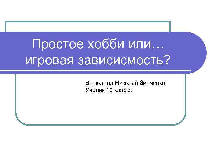 Простое хобби или… игровая зависисмость? Выполнил Николай Зинченко Ученик 10 класса