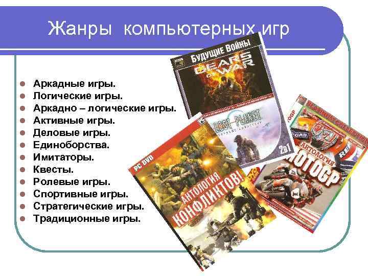 Жанры компьютерных игр l l l Аркадные игры. Логические игры. Аркадно – логические игры. Активные игры. Деловые игры. Единоборства. Имитаторы. Квесты. Ролевые игры. Спортивные игры. Стратегические игры. Традиционные игры.