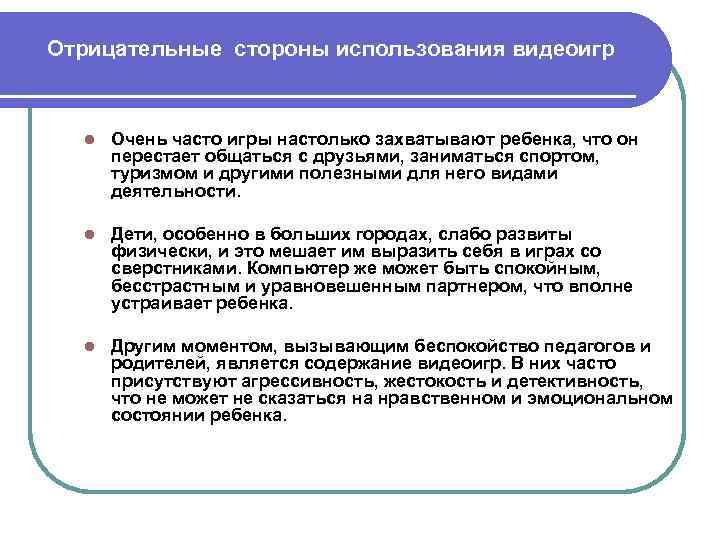 Отрицательные стороны использования видеоигр l Очень часто игры настолько захватывают ребенка, что он перестает общаться с друзьями, заниматься спортом, туризмом и другими полезными для него видами деятельности. l Дети, особенно в больших городах, слабо развиты физически, и это мешает им выразить себя в играх со сверстниками. Компьютер же может быть спокойным, бесстрастным и уравновешенным партнером, что вполне устраивает ребенка. l Другим моментом, вызывающим беспокойство педагогов и родителей, является содержание видеоигр. В них часто присутствуют агрессивность, жестокость и детективность, что не может не сказаться на нравственном и эмоциональном состоянии ребенка.