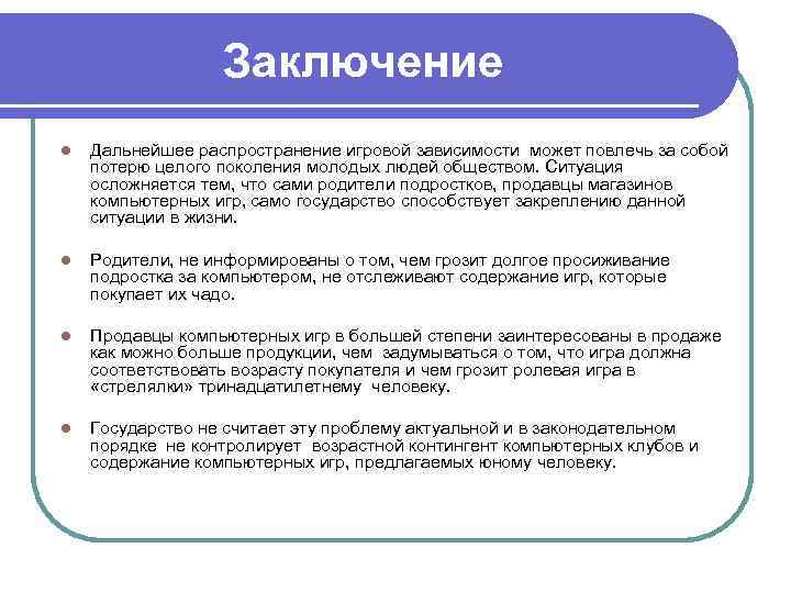 Заключение l Дальнейшее распространение игровой зависимости может повлечь за собой потерю целого поколения молодых людей обществом. Ситуация осложняется тем, что сами родители подростков, продавцы магазинов компьютерных игр, само государство способствует закреплению данной ситуации в жизни. l Родители, не информированы о том, чем грозит долгое просиживание подростка за компьютером, не отслеживают содержание игр, которые покупает их чадо. l Продавцы компьютерных игр в большей степени заинтересованы в продаже как можно больше продукции, чем задумываться о том, что игра должна соответствовать возрасту покупателя и чем грозит ролевая игра в «стрелялки» тринадцатилетнему человеку. l Государство не считает эту проблему актуальной и в законодательном порядке не контролирует возрастной контингент компьютерных клубов и содержание компьютерных игр, предлагаемых юному человеку.