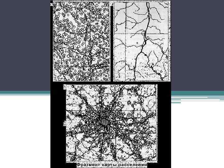 Общие схемы размещения населённых пунктов. На любой карте, показывающей размещение населённых пунктов можно выделить три основные составляющие: • 1)линейное размещение, в котором размещение населённых пунктов предопределяется транспортными магистралями – автомобильными или железными дорогами, судоходными реками; • 2)агломерационное размещение, где скопление населённых пунктов вокруг крупного города в системе расселениясвязано с месторождением полезных ископаемых или выгодным географическим положением; • 3)равномерное размещение – характерно для населённых пунктов, выполняющих функции центров обеспечения товарами и услугами равномерно размещённого сельского населения