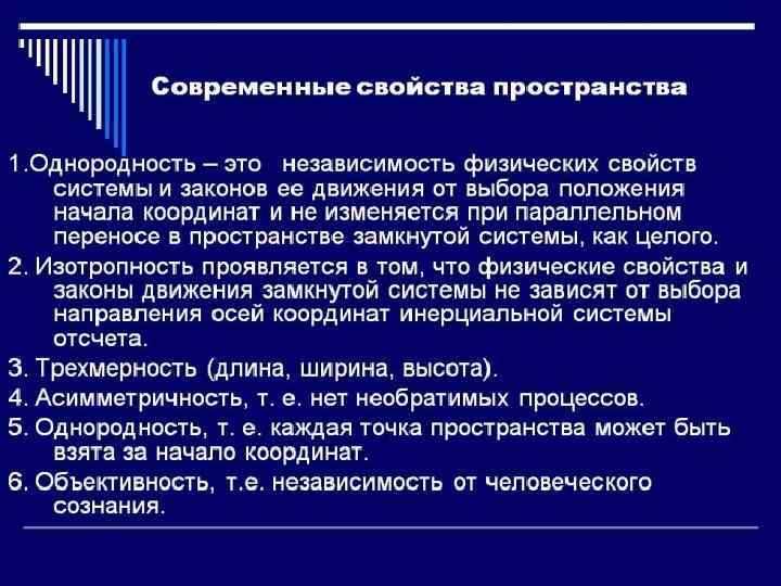 ПРОСТРАНСТВО И ВРЕМЯ Ø Пространство - форма сосуществования материальных объектов и процессов (характеризует структурность и протяженность материальных систем); Ø Время - форма и последовательные смены состояний объектов и процессов (характеризует длительность их бытия).