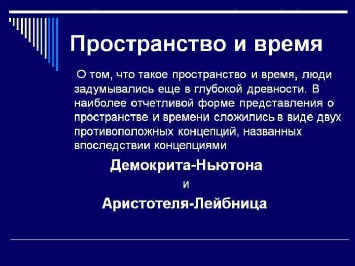 Пространство и время Работу выполнила студентка 511 группы: Курбанова Анжелика Преподаватель: Павлова Наталья Ивановна 2012 г.