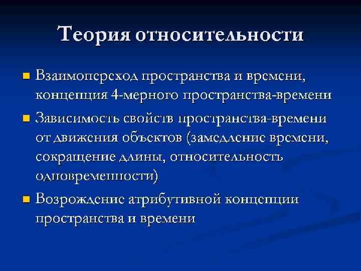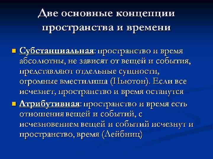 Свойства пространства и времени объективность пространства и времени трехмерность пространства и одномерность времени; изотропность пространства и анизотропия времени (изотропность пространства означает отсутствие в нем каких-либо выделенных направлений; время же анизотропно, поскольку в нем существует явно выделенное направление: оно течет только от прошлого к будущему);