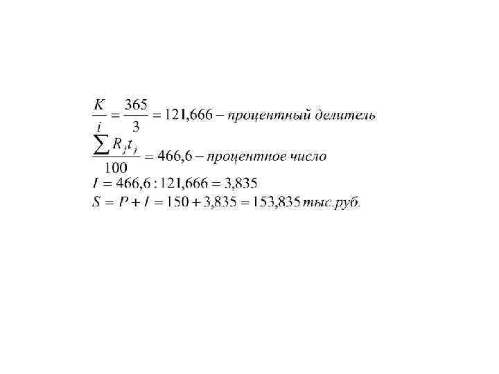 Пример 3. Движение средств на счете характеризуется следующими данными: 05. 02 поступило 150 тыс. руб. , 15. 07 снято 50 тыс. руб. и 20. 10 поступило 80 тыс. руб. Определить сумму на счете на конец года. Процентная ставка 3% годовых. Дата Движение средств Остаток (Rj) Срок (tj) Процентное число 05. 02 150 160 240 15. 07 -50 100 97 97 20. 10 80 180 72 129, 6 31. 12 - 180 - - Итого 466, 6