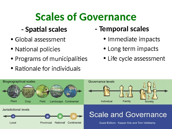 Scales of Governance — Spatial scales • Global assessment • National policies • Programs of municipalities • Rationale for individuals — Temporal scales • Immediate impacts • Long term impacts • Life cycle assessment