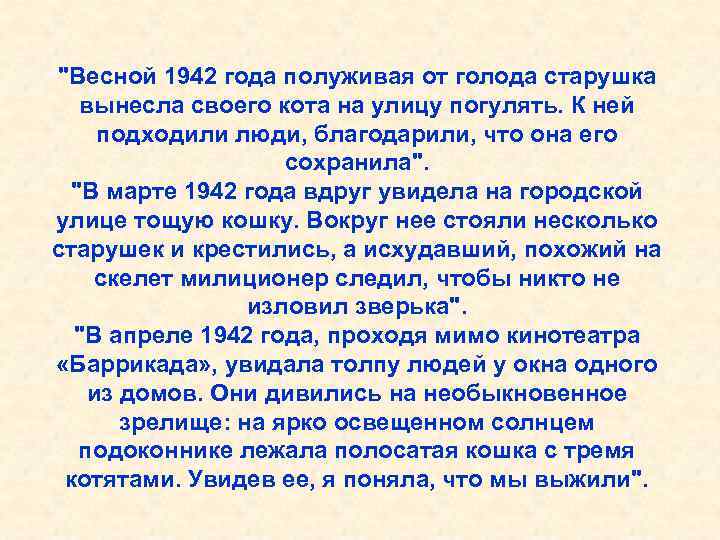 "Весной 1942 года полуживая от голода старушка вынесла своего кота на улицу погулять. К ней подходили люди, благодарили, что она его сохранила". "В марте 1942 года вдруг увидела на городской улице тощую кошку. Вокруг нее стояли несколько старушек и крестились, а исхудавший, похожий на скелет милиционер следил, чтобы никто не изловил зверька". "В апреле 1942 года, проходя мимо кинотеатра «Баррикада» , увидала толпу людей у окна одного из домов. Они дивились на необыкновенное зрелище: на ярко освещенном солнцем подоконнике лежала полосатая кошка с тремя котятами. Увидев ее, я поняла, что мы выжили".