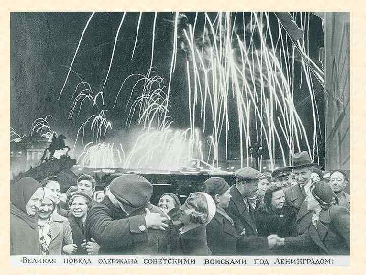За залпом залп, гремит салют. Ракеты в воздухе горячем Цветами пёстрыми цветут. А ленинградцы тихо плачут. Ни успокаивать пока, Не утешать людей не надо. Их радость слишком велика – Гремит салют над Ленинградом.
