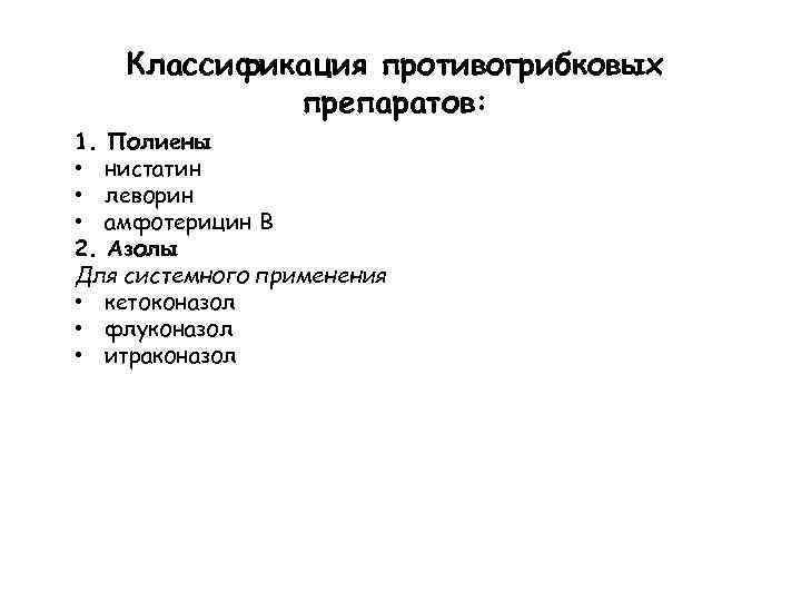Классификация противогрибковых препаратов: 1. Полиены • нистатин • леворин • амфотерицин В 2. Азолы Для системного применения • кетоконазол • флуконазол • итраконазол