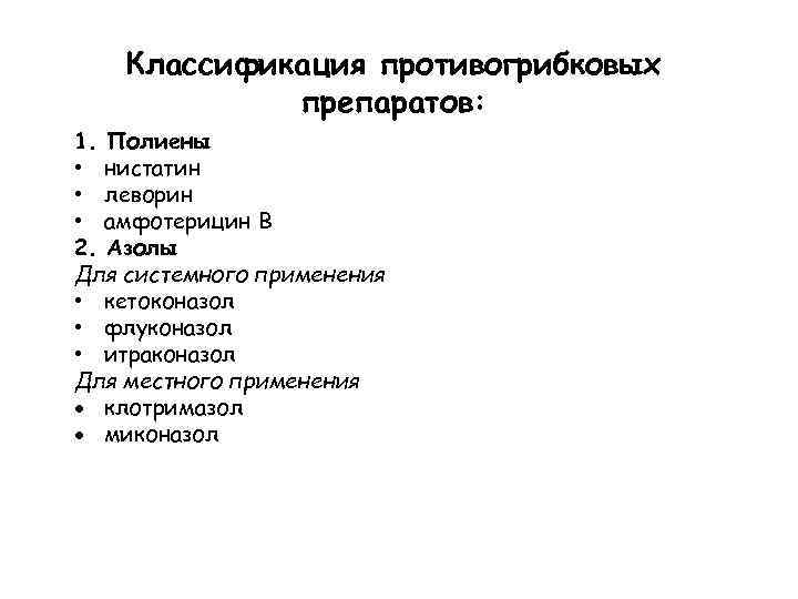 Классификация противогрибковых препаратов: 1. Полиены • нистатин • леворин • амфотерицин В 2. Азолы Для системного применения • кетоконазол • флуконазол • итраконазол Для местного применения клотримазол миконазол