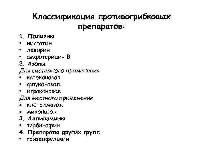 Классификация противогрибковых препаратов: 1. Полиены • нистатин • леворин • амфотерицин В 2. Азолы Для системного применения • кетоконазол • флуконазол • итраконазол Для местного применения клотримазол миконазол 3. Аллиламины • тербинафин