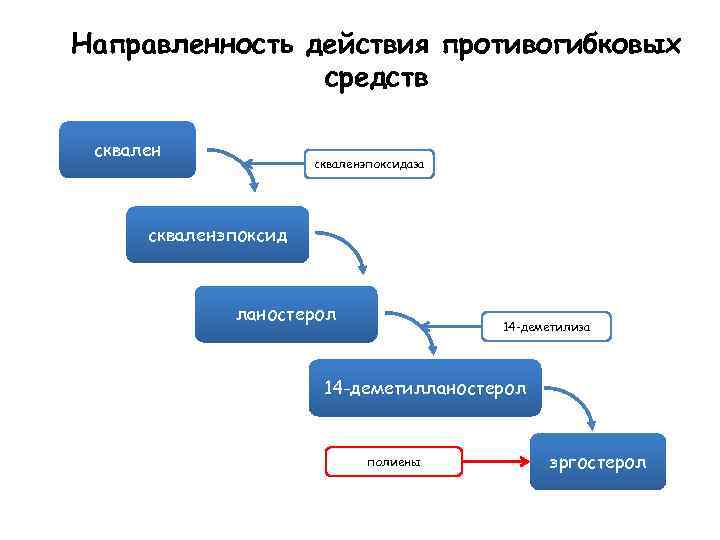 Направленность действия противогибковых средств скваленэпоксидаза аллиламины скваленэпоксид азолы ланостерол 14 -деметилиза 14 -деметилланостерол полиены эргостерол