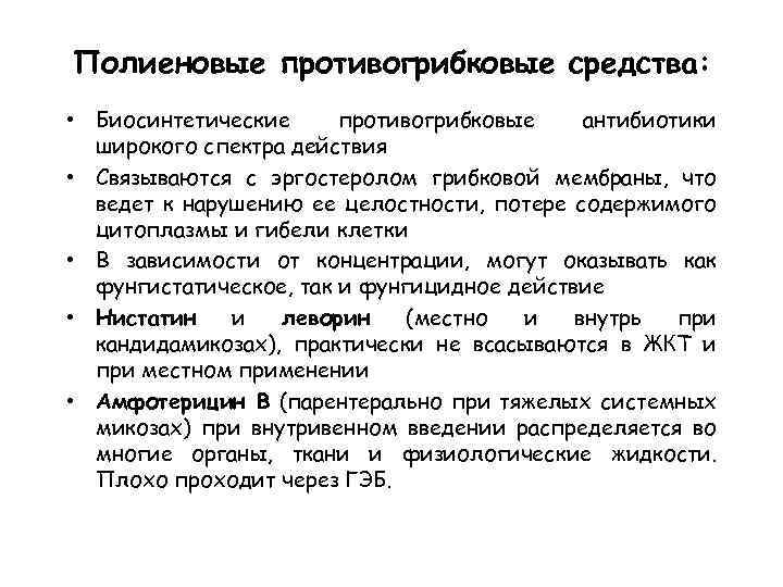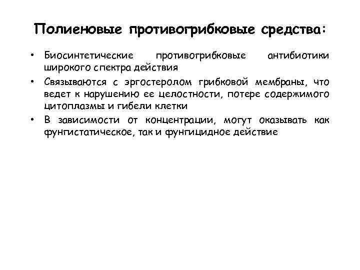 Полиеновые противогрибковые средства: • Биосинтетические противогрибковые антибиотики широкого спектра действия • Связываются с эргостеролом грибковой мембраны, что ведет к нарушению ее целостности, потере содержимого цитоплазмы и гибели клетки • В зависимости от концентрации, могут оказывать как фунгистатическое, так и фунгицидное действие