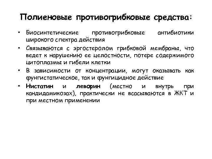 Полиеновые противогрибковые средства: • Биосинтетические противогрибковые антибиотики широкого спектра действия • Связываются с эргостеролом грибковой мембраны, что ведет к нарушению ее целостности, потере содержимого цитоплазмы и гибели клетки • В зависимости от концентрации, могут оказывать как фунгистатическое, так и фунгицидное действие • Нистатин и леворин (местно и внутрь при кандидамикозах), практически не всасываются в ЖКТ и при местном применении