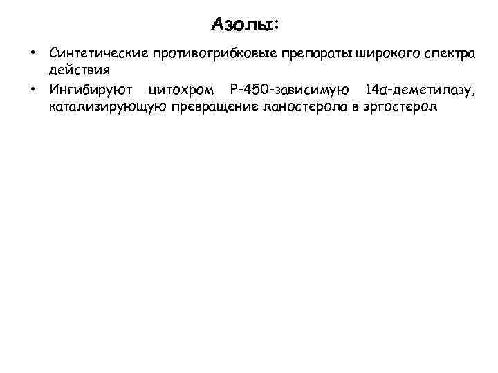 Азолы: • Синтетические противогрибковые препараты широкого спектра действия • Ингибируют цитохром Р-450 -зависимую 14α-деметилазу, катализирующую превращение ланостерола в эргостерол