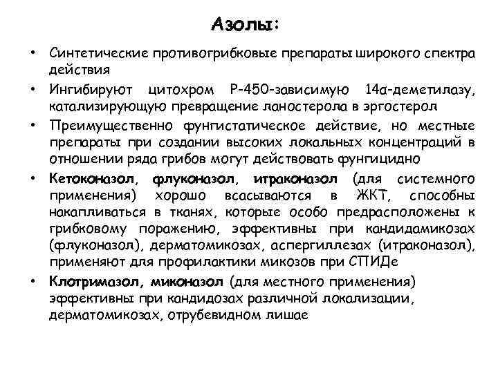 Азолы: • Синтетические противогрибковые препараты широкого спектра действия • Ингибируют цитохром Р-450 -зависимую 14α-деметилазу, катализирующую превращение ланостерола в эргостерол • Преимущественно фунгистатическое действие, но местные препараты при создании высоких локальных концентраций в отношении ряда грибов могут действовать фунгицидно