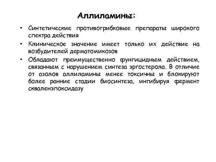 Аллиламины: • Синтетические противогрибковые препараты широкого спектра действия • Клиническое значение имеет только их действие на возбудителей дерматомикозов