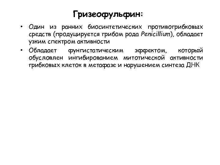 Гризеофульфин: • Один из ранних биосинтетических противогрибковых средств (продуцируется грибом рода Penicillium), обладает узким спектром активности • Обладает фунгистатическим эффектом, который обусловлен ингибированием митотической активности грибковых клеток в метафазе и нарушением синтеза ДНК