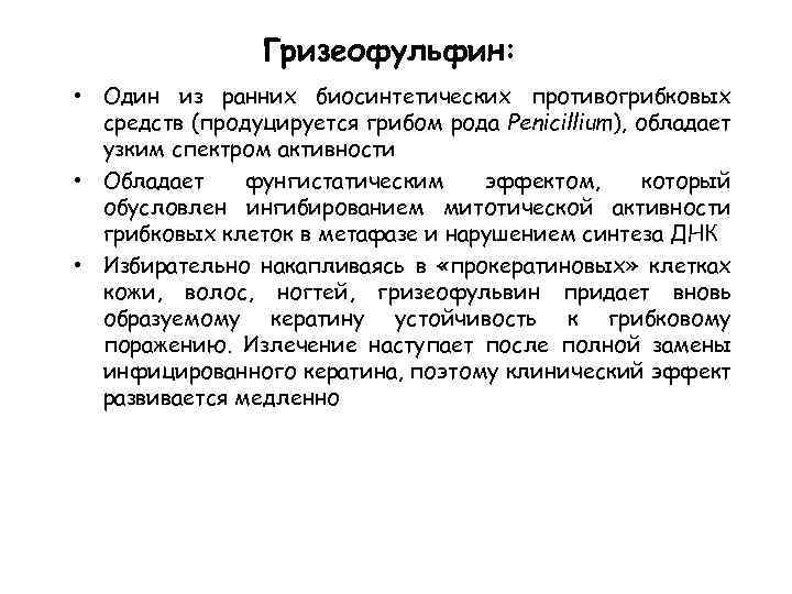 Гризеофульфин: • Один из ранних биосинтетических противогрибковых средств (продуцируется грибом рода Penicillium), обладает узким спектром активности • Обладает фунгистатическим эффектом, который обусловлен ингибированием митотической активности грибковых клеток в метафазе и нарушением синтеза ДНК • Избирательно накапливаясь в «прокератиновых» клетках кожи, волос, ногтей, гризеофульвин придает вновь образуемому кератину устойчивость к грибковому поражению. Излечение наступает после полной замены инфицированного кератина, поэтому клинический эффект развивается медленно