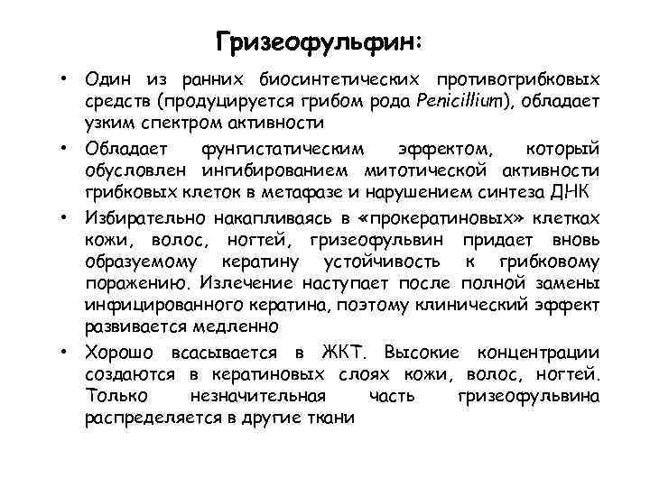 Гризеофульфин: • Один из ранних биосинтетических противогрибковых средств (продуцируется грибом рода Penicillium), обладает узким спектром активности • Обладает фунгистатическим эффектом, который обусловлен ингибированием митотической активности грибковых клеток в метафазе и нарушением синтеза ДНК • Избирательно накапливаясь в «прокератиновых» клетках кожи, волос, ногтей, гризеофульвин придает вновь образуемому кератину устойчивость к грибковому поражению. Излечение наступает после полной замены инфицированного кератина, поэтому клинический эффект развивается медленно • Хорошо всасывается в ЖКТ. Высокие концентрации создаются в кератиновых слоях кожи, волос, ногтей. Только незначительная часть гризеофульвина распределяется в другие ткани