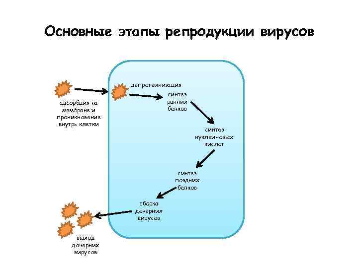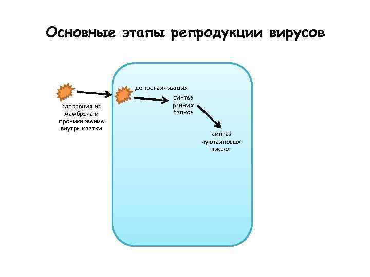 Основные этапы репродукции вирусов депротеинизация адсорбция на мембране и проникновение внутрь клетки синтез ранних белков синтез нуклеиновых кислот синтез поздних белков