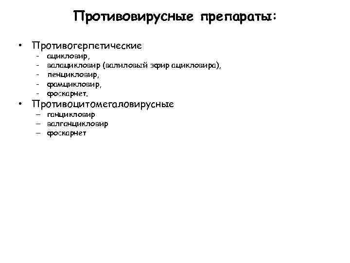 Противовирусные препараты: • Противогерпетические - ацикловир, валацикловир (валиловый эфир ацикловира), пенцикловир, фамцикловир, фоскарнет. • Противоцитомегаловирусные – ганцикловир – валганцикловир – фоскарнет