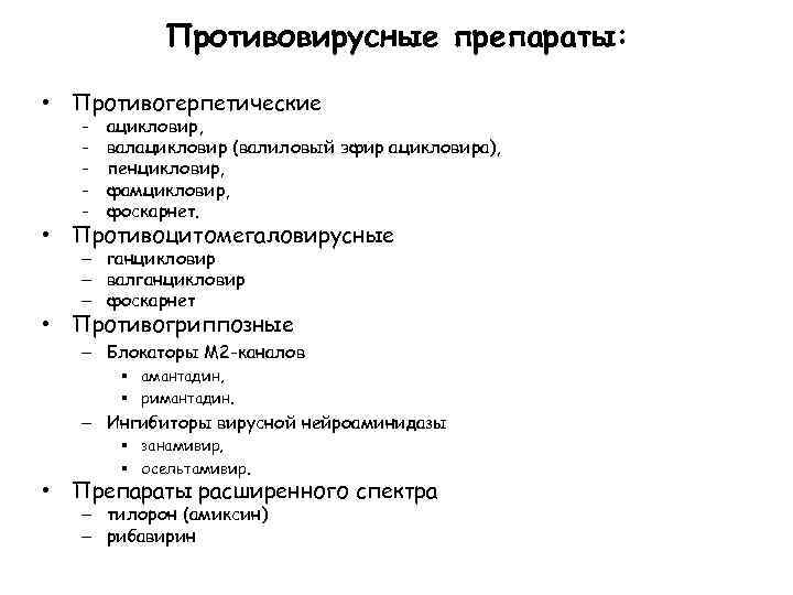 Противовирусные препараты: • Противогерпетические - ацикловир, валацикловир (валиловый эфир ацикловира), пенцикловир, фамцикловир, фоскарнет. • Противоцитомегаловирусные – ганцикловир – валганцикловир – фоскарнет • Противогриппозные – Блокаторы М 2 -каналов § амантадин, § римантадин. – Ингибиторы вирусной нейроаминидазы § занамивир, § осельтамивир.