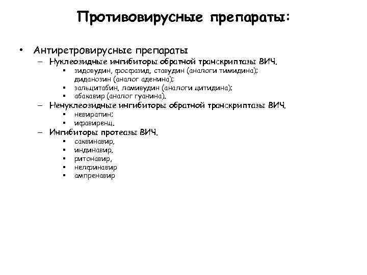 Противовирусные препараты: • Антиретровирусные препараты – Нуклеозидные ингибиторы обратной транскриптазы ВИЧ. § § зидовудин, фосфазид, ставудин (аналоги тимидина); диданозин (аналог аденина); зальцитабин, ламивудин (аналоги цитидина); абакавир (аналог гуанина). § § невирапин; ифавиренц. § § § саквинавир, индинавир, ритонавир, нелфинавир ампренавир § – Ненуклеозидные ингибиторы обратной транскриптазы ВИЧ. – Ингибиторы протеазы ВИЧ.