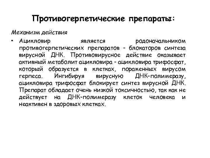 Противогерпетические препараты: Механизм действия • Ацикловир является родоначальником противогерпетических препаратов - блокаторов синтеза вирусной ДНК. Противовирусное действие оказывает активный метаболит ацикловира - ацикловира трифосфат, который образуется в клетках, пораженных вирусом герпеса. Ингибируя вирусную ДНК-полимеразу, ацикловира трифосфат блокирует синтез вирусной ДНК. Препарат обладает очень низкой токсичностью, так как не действует на ДНК-полимеразу клеток человека и неактивен в здоровых клетках.
